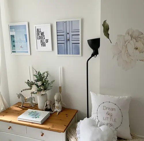 Разнообразить фотоколлаж можно постерами с любимыми цитатами и рисунками. Например, их можно повесить на стену, поставить на полку или комод вперемежку со снимками.