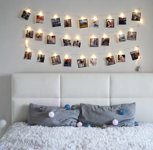 Если вам нравится декоративный свет, то вместо бечёвки можно использовать гирлянду — лучше прозрачную или белую, если у вас светлые стены. Так она не будет бросаться в глаза, а огоньки подсветят фотографии, и акцент будет на именно на них.